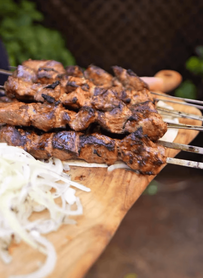 Skewered, marinated meat grilled over open flame until smoky and tender. It’s a staple across Turkic and Slavic cultures, known for its bold seasoning, charred edges, and juicy bite, often served with fresh herbs, onions, and flatbread.